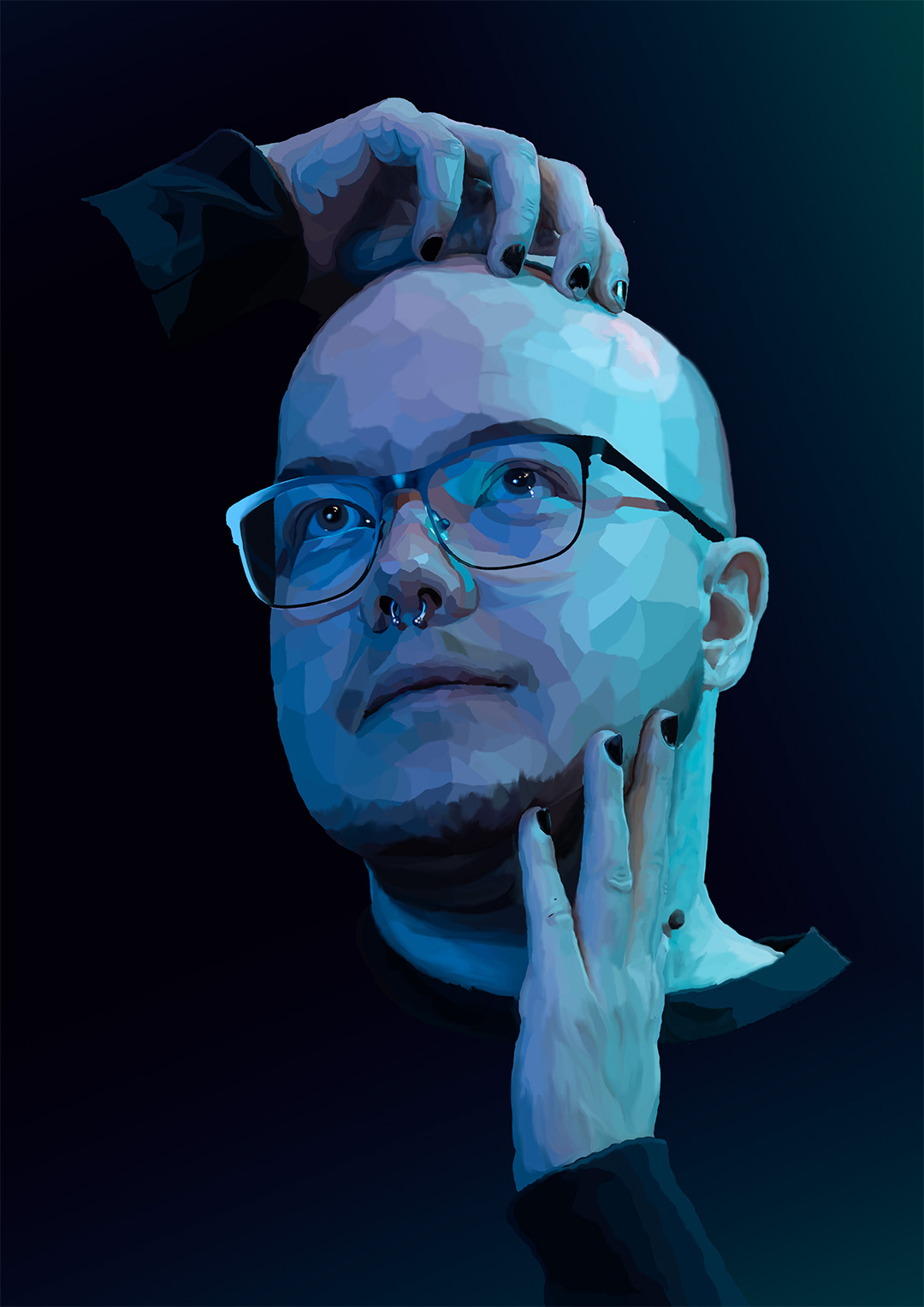 Tehtävänä oli maalata muotokuva luokkakaverista kuvan päälle Photoshopissa. Harjoiteltiin piirtopöydän ja Photoshopin työkalujen käyttöä. Valitsin kuvan mielenkiintoisten värien, valojen ja asennon innoittamana. Alkuperäinen valokuva on tekemästämme valaisuharjoituksesta värivaloilla. Maalatessa huomio…